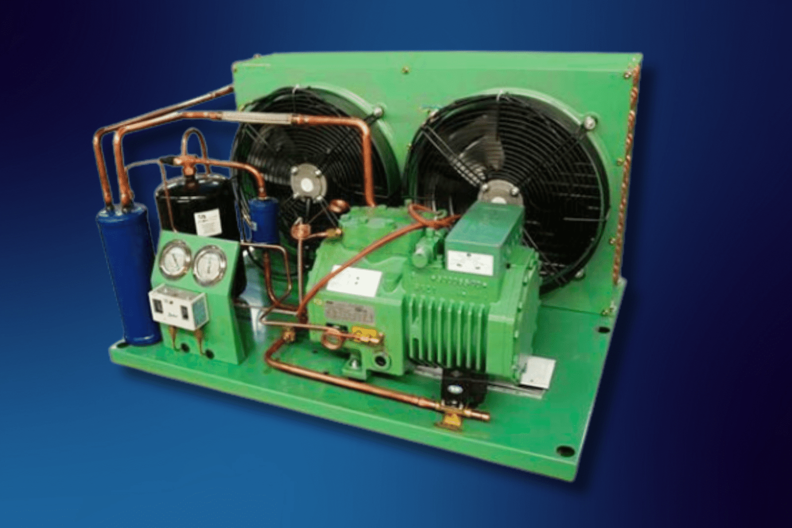 - Efficient heat rejection via air-cooled condensers with heavy-duty axial fans